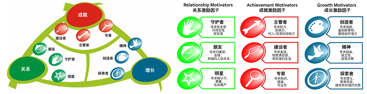 激励图谱将人的激励归纳为三个簇群:关系、成就和成长。在每个簇群中分别有三个激励因子,共计有九个单独的激励因子(如下图)。其中,有三个通常会特别强大,这之中最突出的一个就是核心激励因子。激励图谱测评系统通过提出一些简单但相关的问题,然后根据测评者对这些问题的回答而生成一个独特的个人图谱分析报告,报告详细说明每个激励因子的贡献及其如何影响个人表现。激励图谱以易于阅读的报告形式呈现,准确描述了个人的激励因子以及如何利用这些自我知识去采取可实施的实际行动以提高激励水平。