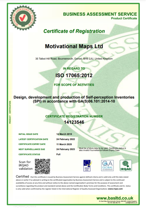 Motivational Maps®(激励图谱)获得了ISO/IEC(17065)国际认证这证明了该分析工具能提供准确有效和无偏见的数据,并符合自我感知量表的相关合规标准。